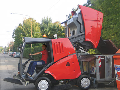 The compact street sweeper can discharge into a normal road bins to work for longer without stopping.